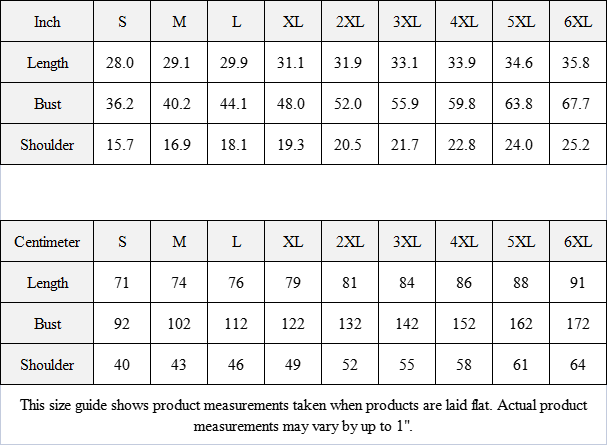 inch | S | M | L | XL | 2XL | 3XL | 4XL | 5XL | 6XL |