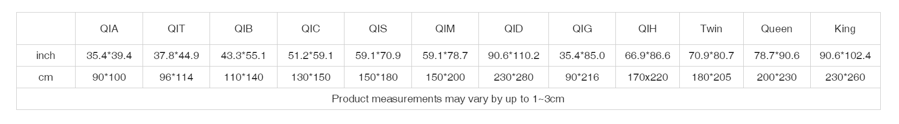 cm | 90*100 | 96*114 | 110*140 | 130*150 | 150*180 | 150*200 | 230*280 | 190*216 | 170x220 | 180*205 | 200*230 | 230*260 |