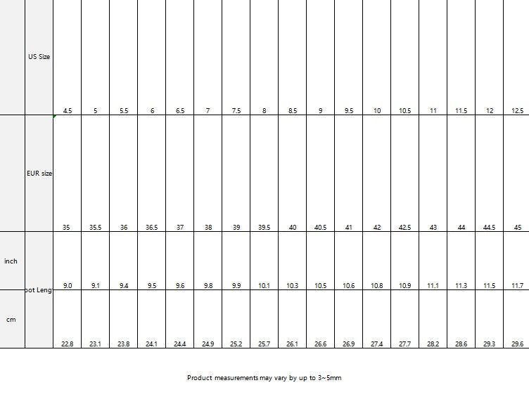 EUR Size | US Size | Insole Length(inch) | Insole Length(mm) |